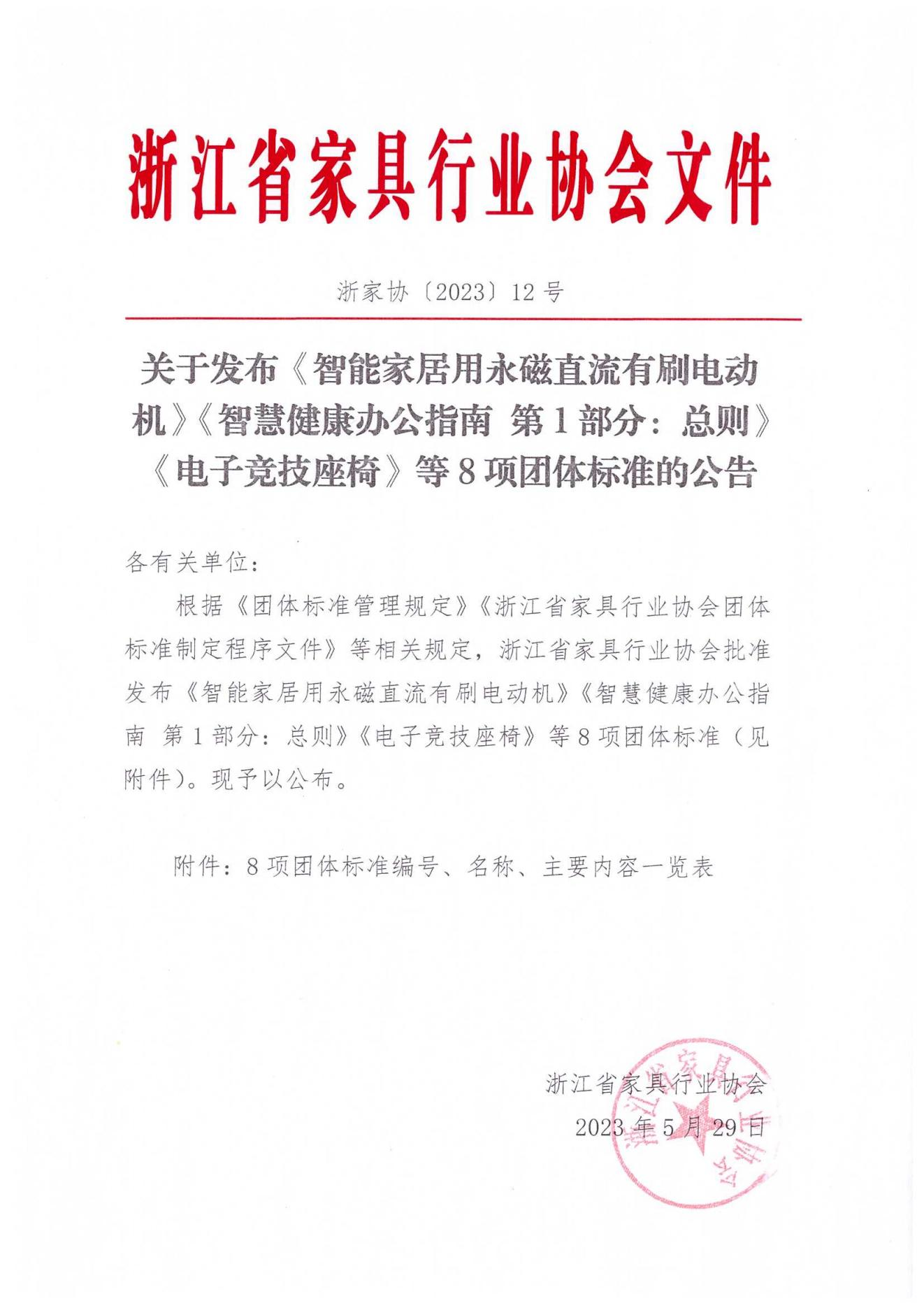 根據(jù)《團(tuán)體標(biāo)準(zhǔn)管理規(guī)定》《浙江省家具行業(yè)協(xié)會(huì)團(tuán)體標(biāo)準(zhǔn)制定程序文件》等相關(guān)規(guī)定,浙江省家具行業(yè)協(xié)會(huì)批準(zhǔn)發(fā)布《智能家居用永磁直流有刷電動(dòng)機(jī)》《智慧健康辦公指南 第1部分:總則》《電子競(jìng)技座椅》等8項(xiàng)團(tuán)體標(biāo)準(zhǔn)(見附件)。現(xiàn)予以公布。